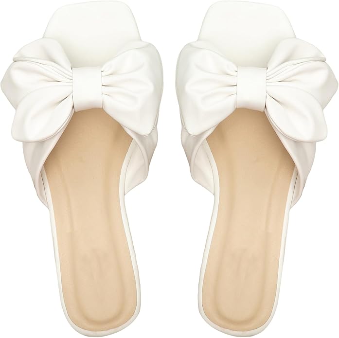Women's Bow Flat Sandals Dressy Square Open Toe Sandals Comfortable Slip On Slide Sandals