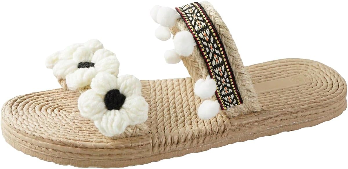 Women's Boho Style Floral Decor Open Toe Straw Flat Sandals Two Straps Vacation Beachwear Slides