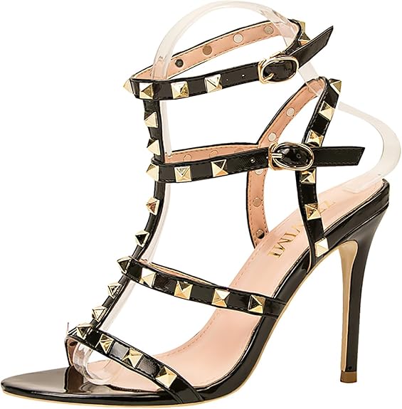 Women's Studded Strappy Leather Stiletto Heels Sandals with Adjustable Ankle Buckle Sexy Open Pointed Toe Fashion T-Strap Roman