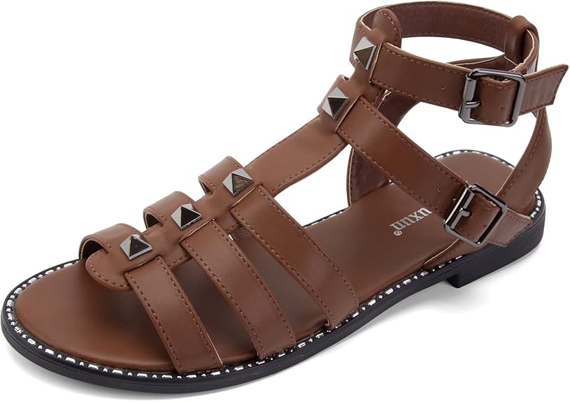 Women's Flat Sandals Two Buckle Ankle Strap Open Toe Dressy Summer Strappy Gladiator Sandals Studded Sandal For Women