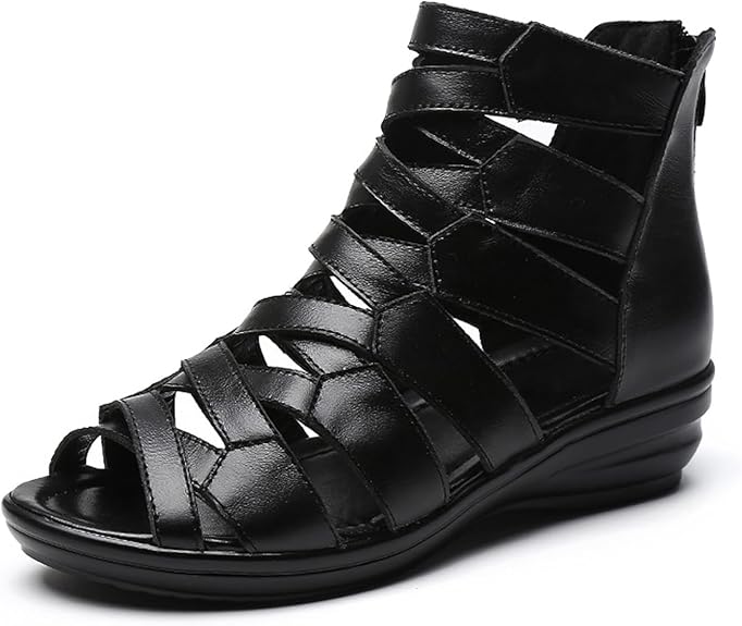 Women Black Leather High Top Gladiator Sandals,Summer Peep Toe Hollow Back Zipper Dressy Flat Roman Sandals Wedges Sandals